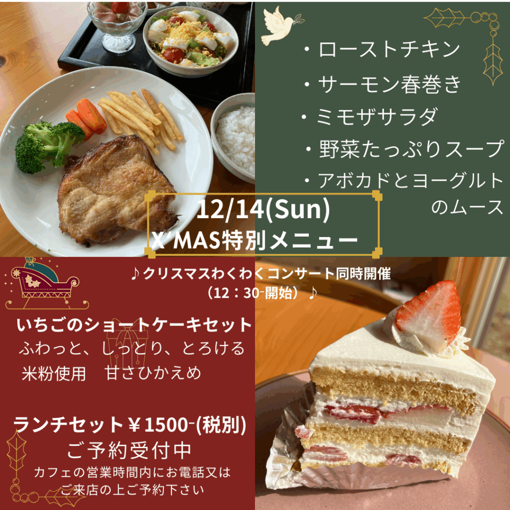 12/14(日) クリスマスコンサートコラボランチ クリスマスコンサートとともに、 クリスマススペシャルメニューを堪能しましょう! お母さんランチにいちごのショートケーキがついて、 1,500円(税別)でお楽しみいただけます。 要予約・テイクアウト可