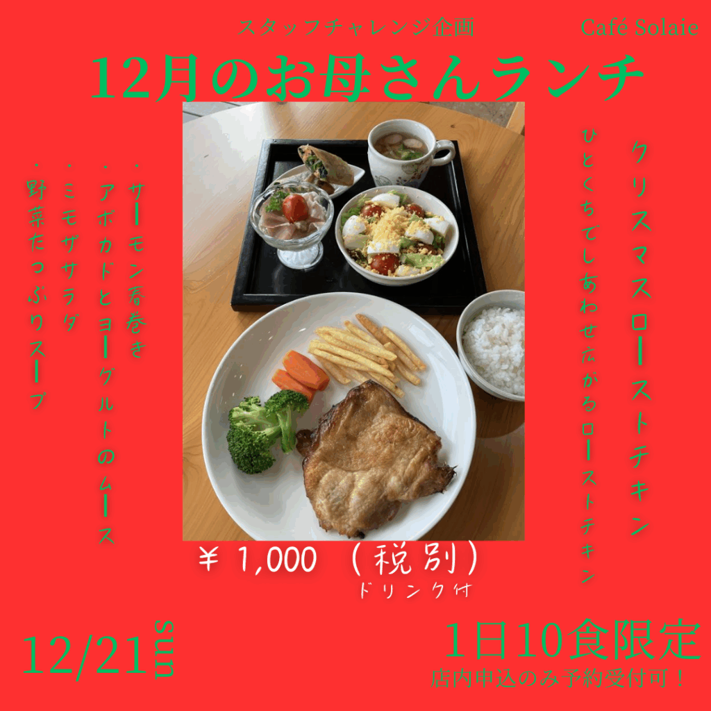 12月のお母さんランチはクリスマスにぴったりのローストチキン。 一口で幸せが口いっぱいに広がります。 副菜はサーモンの春巻き、アボカドヨーグルトのムース。 ミモザサラダと野菜たっぷりのスープです。 12/21(日) 一日10食限定 店内申込のみ予約受付可! 1,000円(税別)ドリンク付き