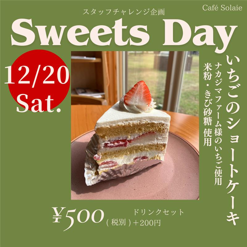 12/20(土)Sweets Day 500円 ※限定12ピース +ドリンクセット200円 予約可、テイクアウト可 ・いちごのショートケーキ 今年も中島ファーム様の甘くてみずみずしい いちごを使ったショートケーキが登場します。 米粉ならではの優しい味わいを存分にお楽しみください。