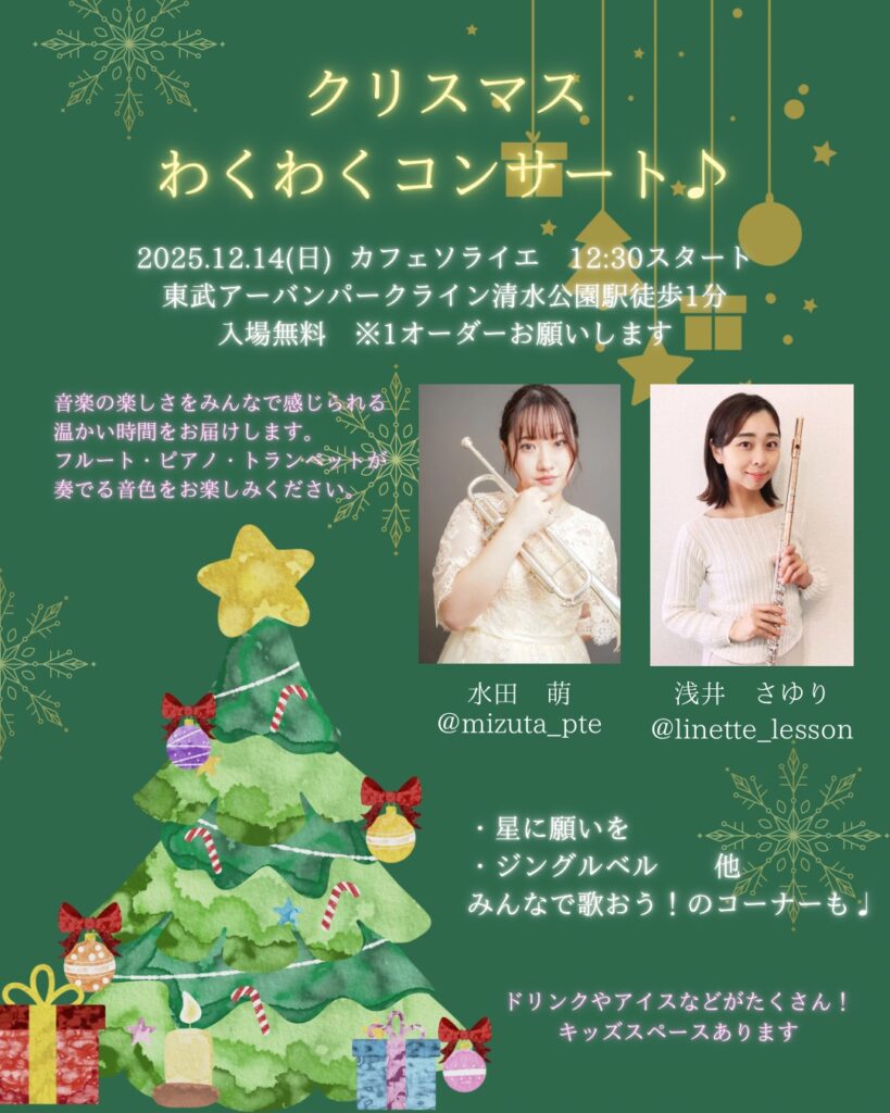 12/14(日)カフェソライエにて12:30スタート! 東部アーバンパークライン「清水公園駅」徒歩1分 入場無料 ※1オーダー制です。 子どもも大人も、一人でもみんなで楽しめる参加型コンサートです。 クリスマスソングを一緒に歌ったり、リズムに合わせて 手拍子したり、音楽の楽しさをみんなで感じられる時間を過ごしましょう。 フルート、ピアノ、トランペットの美しい音色がクリスマスを彩ります。