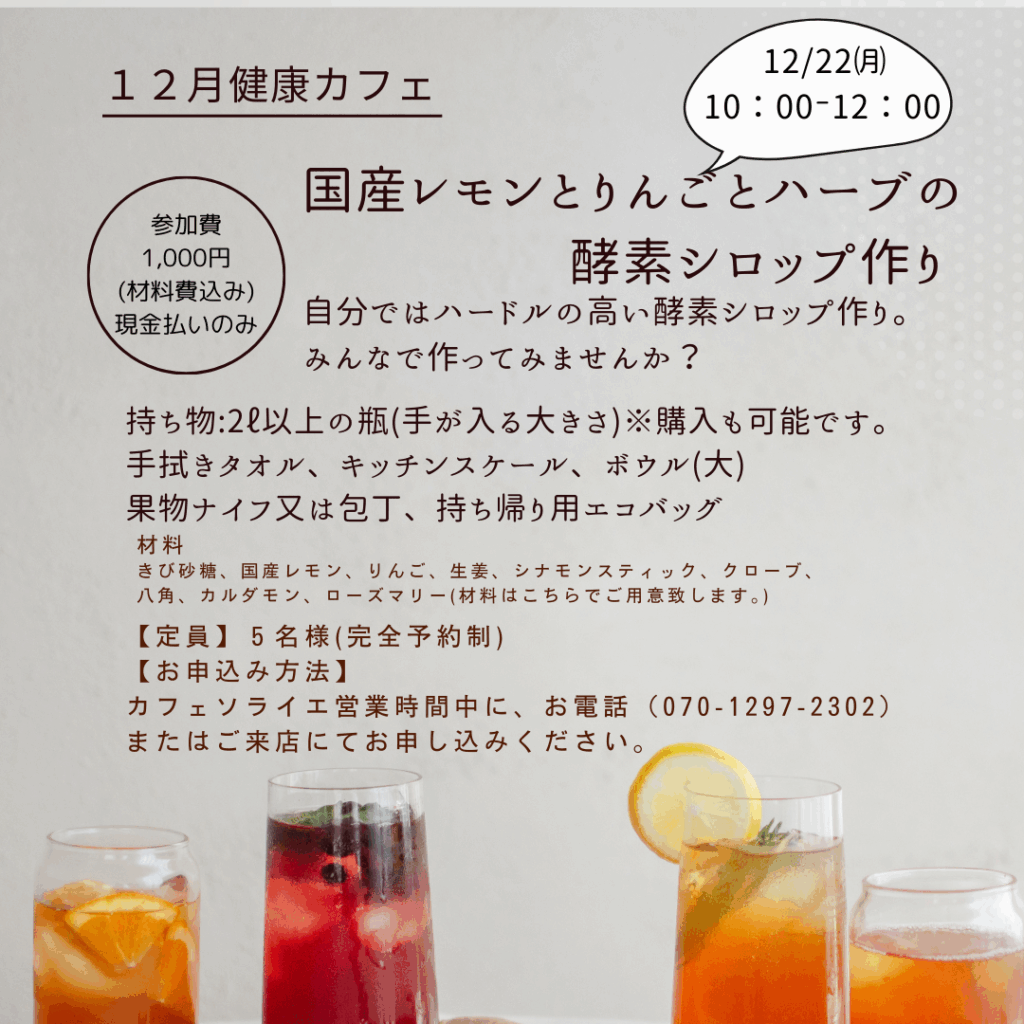 持ち物:2L以上の瓶(手に入る大きさ)※購入も可能です。 手拭きタオル、キッチンスケール、ボウル(大) 果物ナイフまたは包丁、持ち帰り用エコバッグ 材 料:きび砂糖、国産レモン、りんご、生姜、シナモンスティック クローブ、八角、カルダモン、ローズマリー (材料はこちらでご用意いたします。) 定 員:5名様(完全予約制) お申し込み方法:カフェソライエ営業時間中にお電話にて。(070-1297-2302) またはご来店にてお申し込みください。